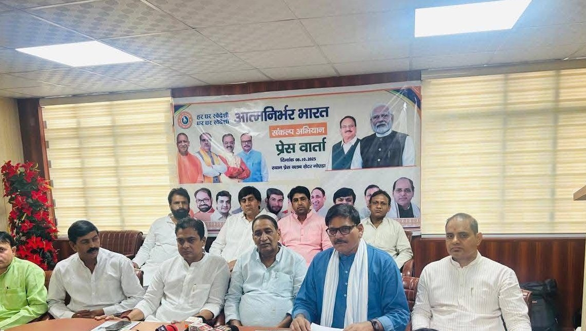 संचार नाउ। आत्मनिर्भर भारत संकल्प अभियान के तहत देश को सामाजिक और आर्थिक रूप से सशक्त बनाने के उद्देश्य से भारतीय जनता पार्टी की गौतमबुद्ध नगर जिला इकाई द्वारा ग्रेटर नोएडा जर्नलिस्ट प्रेस क्लब में एक प्रेस वार्ता का आयोजन किया गया। इस मौके पर “हर घर स्वदेशी – घर-घर स्वदेशी” का संदेश देते हुए स्थानीय उत्पादों और स्वदेशी उद्योगों को बढ़ावा देने का संकल्प लिया गया। प्रेस वार्ता में जिला अध्यक्ष अभिषेक शर्मा, दादरी विधायक तेजपाल नागर, जेवर विधायक धीरेंद्र सिंह, जिला उपाध्यक्ष सत्येंद्र नगर, मीडिया प्रभारी कर्मवीर आर्य, गुरुदेव भाटी, विमल पुंडीर, सुशील भाटी, वीरेंद्र भाटी सहित अन्य पदाधिकारी एवं कार्यकर्ता उपस्थित रहे।