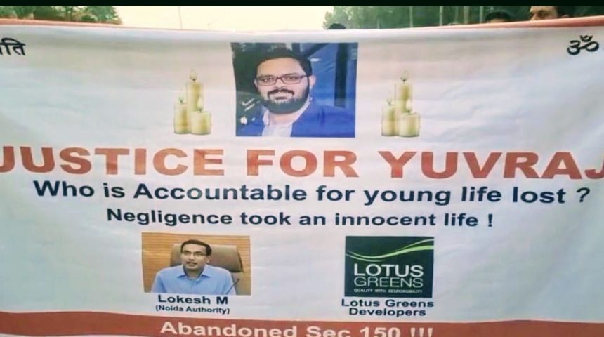 संचार नाउ। ग्रेटर नोएडा के सेक्टर-150 में सॉफ्टवेयर इंजीनियर युवराज मेहता की मौत के बाद न्याय की मांग को लेकर परिजन और सोसायटी के लोग सड़कों पर उतर आए। शनिवार को बड़ी संख्या में लोगों ने कैंडल मार्च निकालकर नोएडा प्राधिकरण और पुलिस प्रशासन के खिलाफ आक्रोश जताया। कैंडल मार्च के दौरान जस्टिस फॉर युवराज के बैनर तले नोएडा अथॉरिटी के सीईओ और लोटस ग्रीन डेवलपर्स के खिलाफ जमकर नारेबाजी की गई।