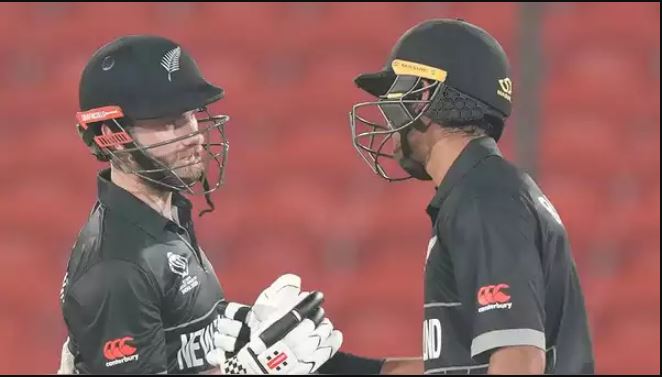 कप्तान केन विलियमसन ने लंबे समय बाद वापसी करते हुए अर्धशतक बनाया जिससे न्यूजीलैंड की टीम ने पाकिस्तान के इस स्कोर को बौना साबित करने में कोई कसर नहीं छोड़ी। रवींद्र ने पारी का आगाज करते हुए 72 गेंद पर 97 रन की तूफानी पारी खेली जिसमें 16 चौके और एक छक्का शामिल है। विलियमसन (54) और डैरेल मिशेल (59) ने रिटायर्ड हर्ट होने से पहले अर्धशतक पूरे किये जबकि मार्क चैपमैन ने 41 गेंद पर नाबाद 65 रन बनाए जिससे न्यूजीलैंड ने 43.4 ओवर में पांच विकेट पर 346 रन बनाकर विश्व कप से पहले मनोबल बढ़ाने वाली जीत हासिल की।
