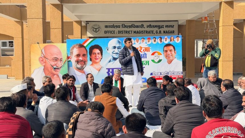 संचार नाउ। केंद्र सरकार द्वारा महात्मा गांधी राष्ट्रीय ग्रामीण रोजगार गारंटी अधिनियम (मनरेगा) के मूल स्वरूप में बदलाव और उसे तथाकथित जी-राम-जी प्रणाली में परिवर्तित किए जाने के विरोध में जिला कांग्रेस कमेटी गौतमबुद्ध नगर ने सोमवार को जिला मुख्यालय सूरजपुर पर “मनरेगा बचाओ संग्राम” के तहत एकदिवसीय अनशन किया। अनशन का नेतृत्व जिला कांग्रेस अध्यक्ष दीपक भाटी चोटीवाला ने किया।