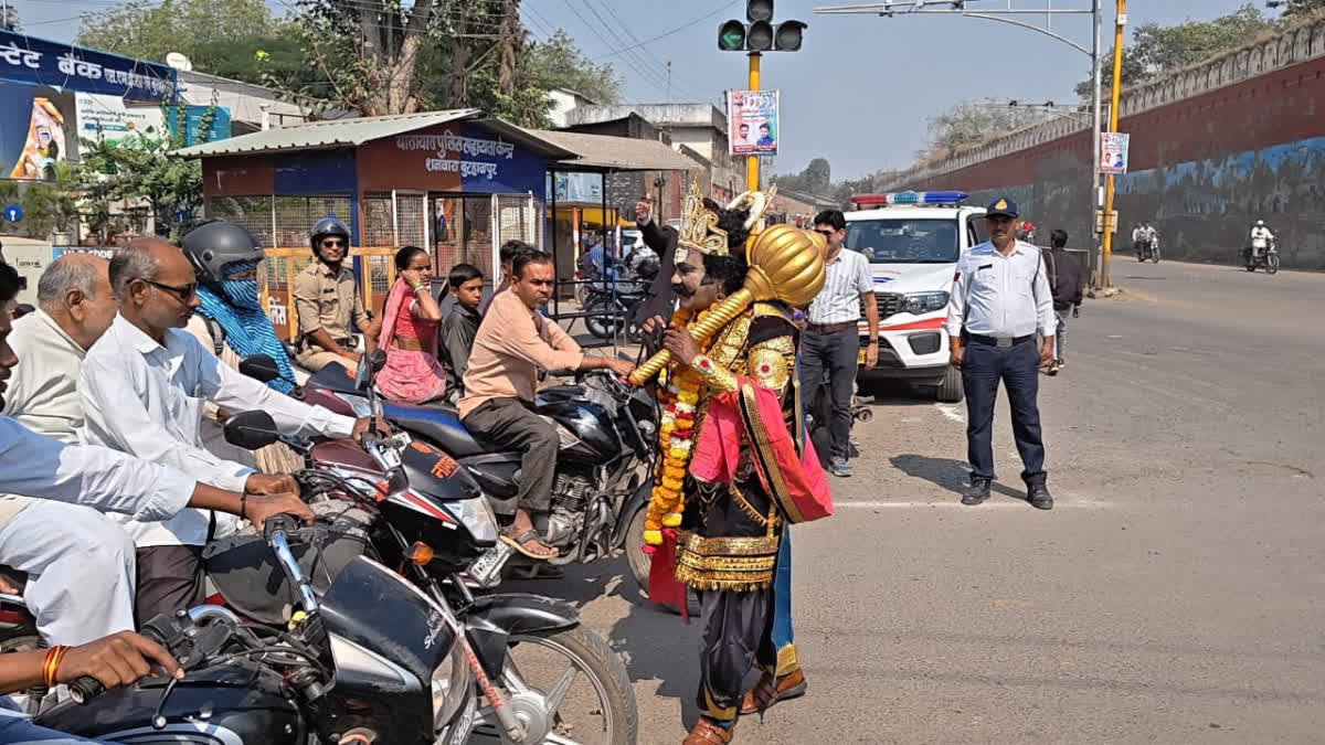 उत्तर प्रदेश के मुरादाबाद शहर में सोमवार को सड़क पर कुछ ऐसा नज़ारा देखने को मिला जिसने लोगों का ध्यान अपनी ओर खींच लिया। यातायात माह के अवसर पर शहर के पीलिकोठी चौराहे पर एक व्यक्ति ‘यमराज’ का रूप धारण कर लोगों को मज़ेदार और प्रभावी तरीके से ट्रैफिक नियमों का महत्व समझाता नज़र आया। यह अनोखा अभियान परिवर्तन दा चेंज संस्था और ट्रैफिक पुलिस द्वारा संयुक्त रूप से आयोजित किया गया, जिसने राह चलते लोगों के चेहरे पर मुस्कान के साथ-साथ जिम्मेदारी का भाव भी पैदा किया।